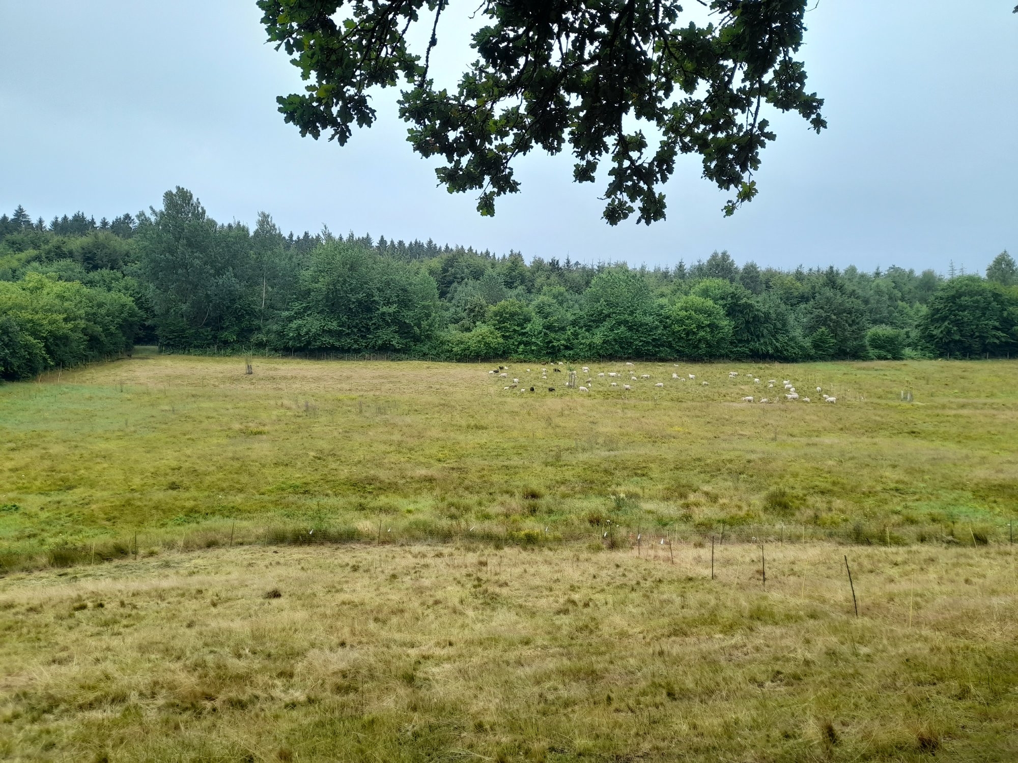 Bild: Da sieht man die Menge ganz gut. Sie stehen so eng, weil da frisch dazu gezäunt wurde. Zum Widerkäuen verteilen sie sich mehr. Witzig immer wieder, dass sie sich nach Farben, sprich Rassen aufteilen. Und dass sich dieses mal die Skudden nicht die Butter vom Brot nehmen lassen. Selbstbewusste Zibben. Ich liebe sie.