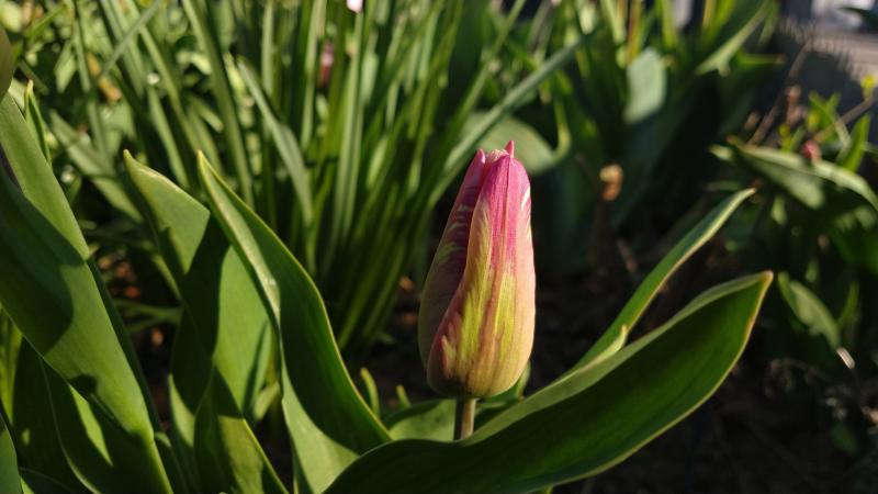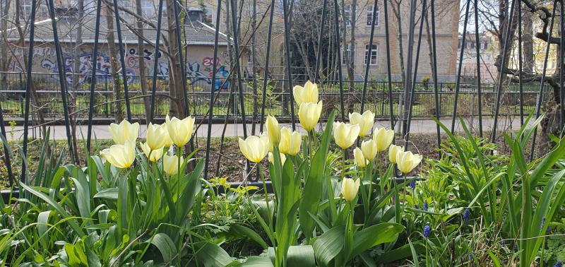 Diese Blüte zeigt sich plötzlich bei einem Pulk Tulpen.