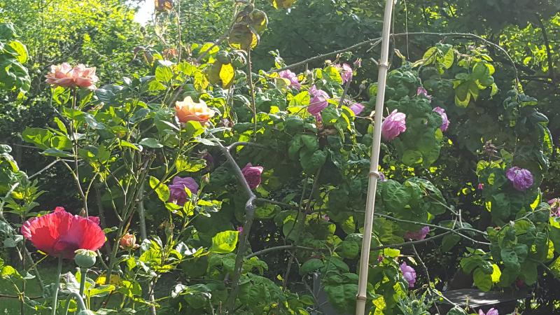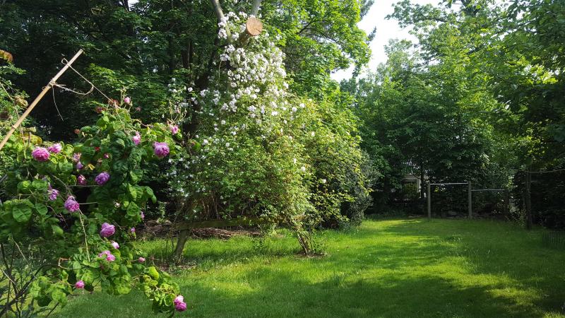 Noch ein paar Schritte und eine Drehung weiter, nochmal Centifolie, im Hintergrund Pauls Himalyan Musk