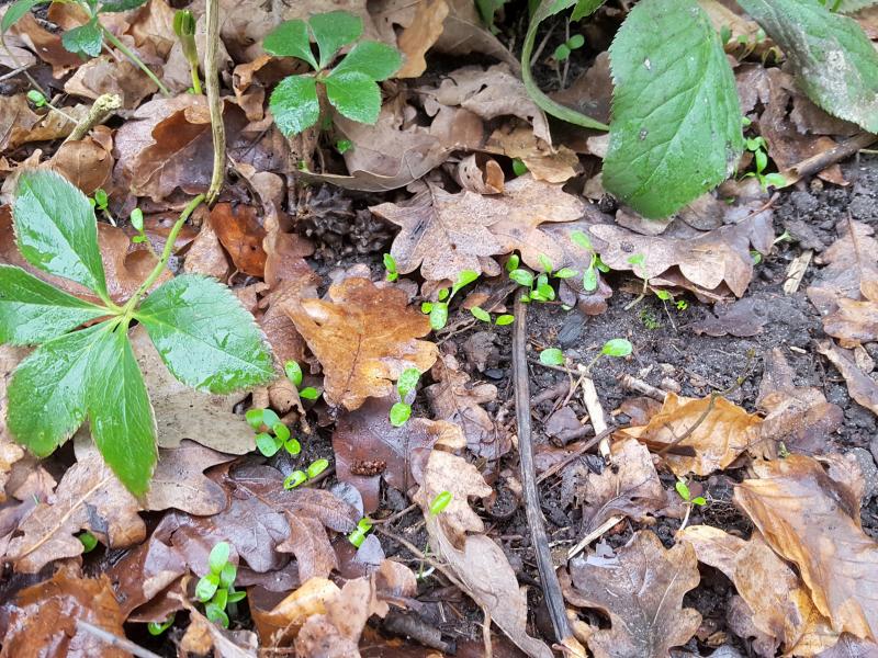 Helleborus x orientalis Sämlinge schießen wie Sämlinge aus dem Boden.