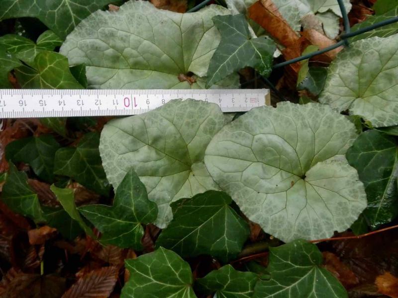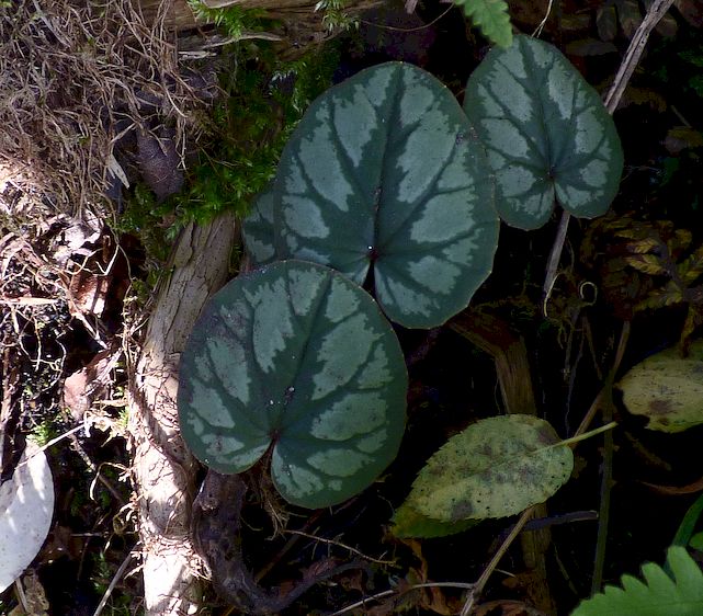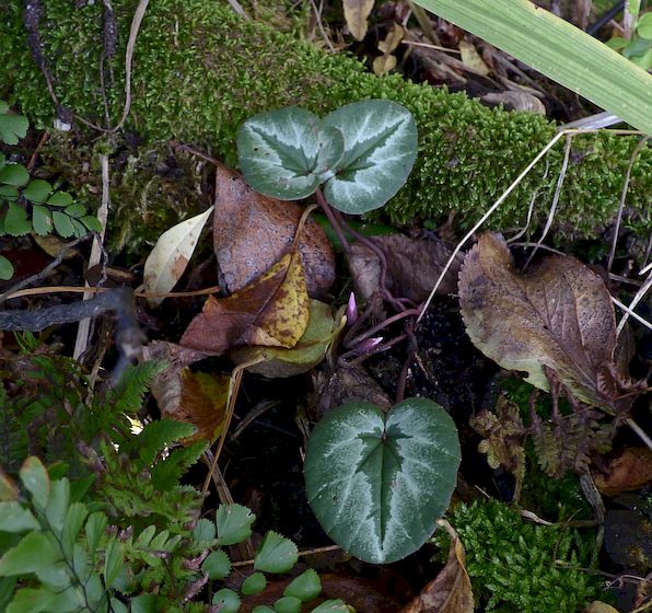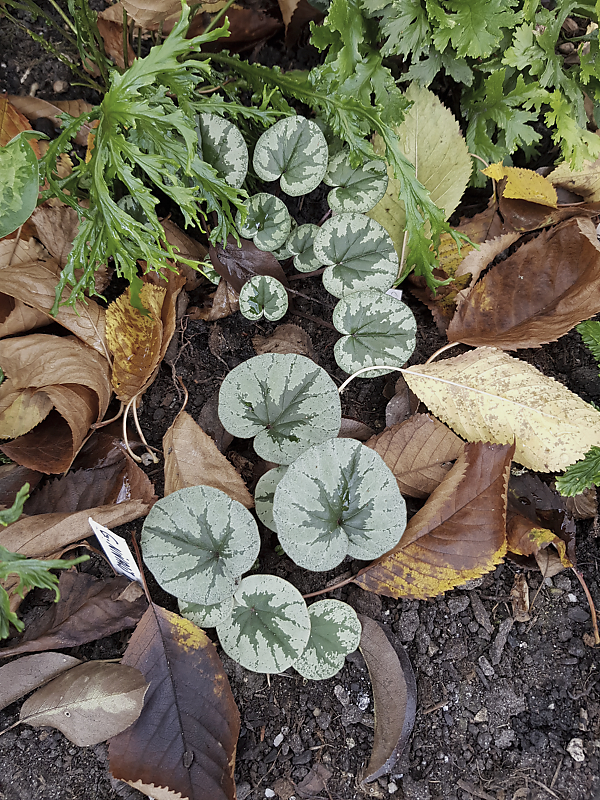 Ein Herbstalpenveilchen, das sich bei mir am Eingangsweg ausgesät hat, hat ungewöhnlich große silbrige Blätter: