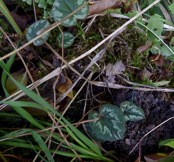 Hier ist bei diversen C. coum auch schon seit Ende Oktober der Blattaustrieb komplett. Die Knospen zeigen teilweise Farbe und liegen auf der Erde unter dem Blätterdach.
