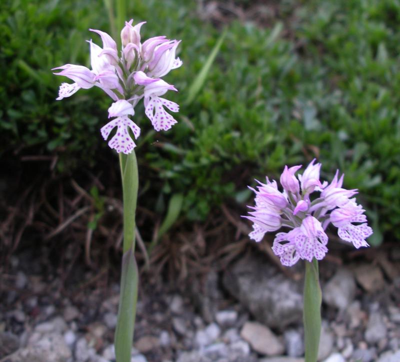 Vielleicht mein bester Pflanzenkauf überhaupt. Vor etlichen Jahren erwarb ich im Abverkauf eines Gartencenters zwei halbvertrocknete traurige Orchideen. Inzwischen stehen weit mehr als 100 Abkömmlinge durch Selbstaussaat in meinem Garten. Da alle Exemplare sowohl in Blatt wie auch in Blüte äußerst einheitlich sind, könnte es sich vielleicht sogar um eine Art der Gattung Dactylorhiza handeln - und nicht um eine Hybride, wie ich angenommen hatte. Kann evtl. jemand was dazu sagen?