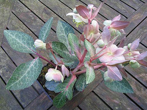 @farsDas ist ein reiner Helleborus lividus, wird seit zwei Jahren manchmal in Blumengeschäften und Baumärkten angeboten. Irm hat recht, der ist so gut wir gar nicht winterhart! Läßt sich aber hervorragend als Kübelpflanze halten. Am besten in einen Rosentopf setzen und über Sommer an einer nicht zu sonnigen Stelle einsenken. Ältere Pflanzen fangen dann ab Oktober an zu blühen. Vor den ersten Frösten dann an einem kühlen Überwinterungsplatz. Meinen senke ich immer neben einem Rosmarin ein so bekommt er Sonne ist aber in den heißen Mittagsstunden schattiert durch den Rosmarin, das scheint ihm gut zu gefallen. H. sternii ist eine Hybride zwischen H. argutifolius als Samenträger und H. lividus als Pollenspender. 'Boughton Beauty' geht mehr in Richtung lividus, gute Sämlinge sind stark rosa überhaucht und werden nicht höher als 30 cm, der Stamm wohlgemerkt! H. lividus bildet zwar auch einen Stamm, dieser ist aber sehr dünn und so kurz, dass er kaum ins Auge fällt.Genau wie bei deinem Fars! LG., Oliver.