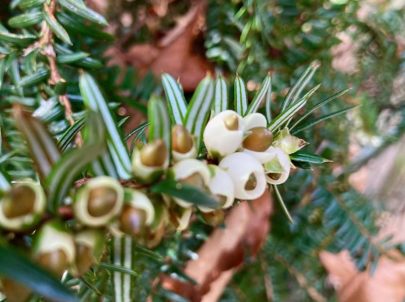 Einige Zweige von Pseudotaxus chienii sitzen voll weisser Beeren... leider nicht ganz scharf das Bild... :-\