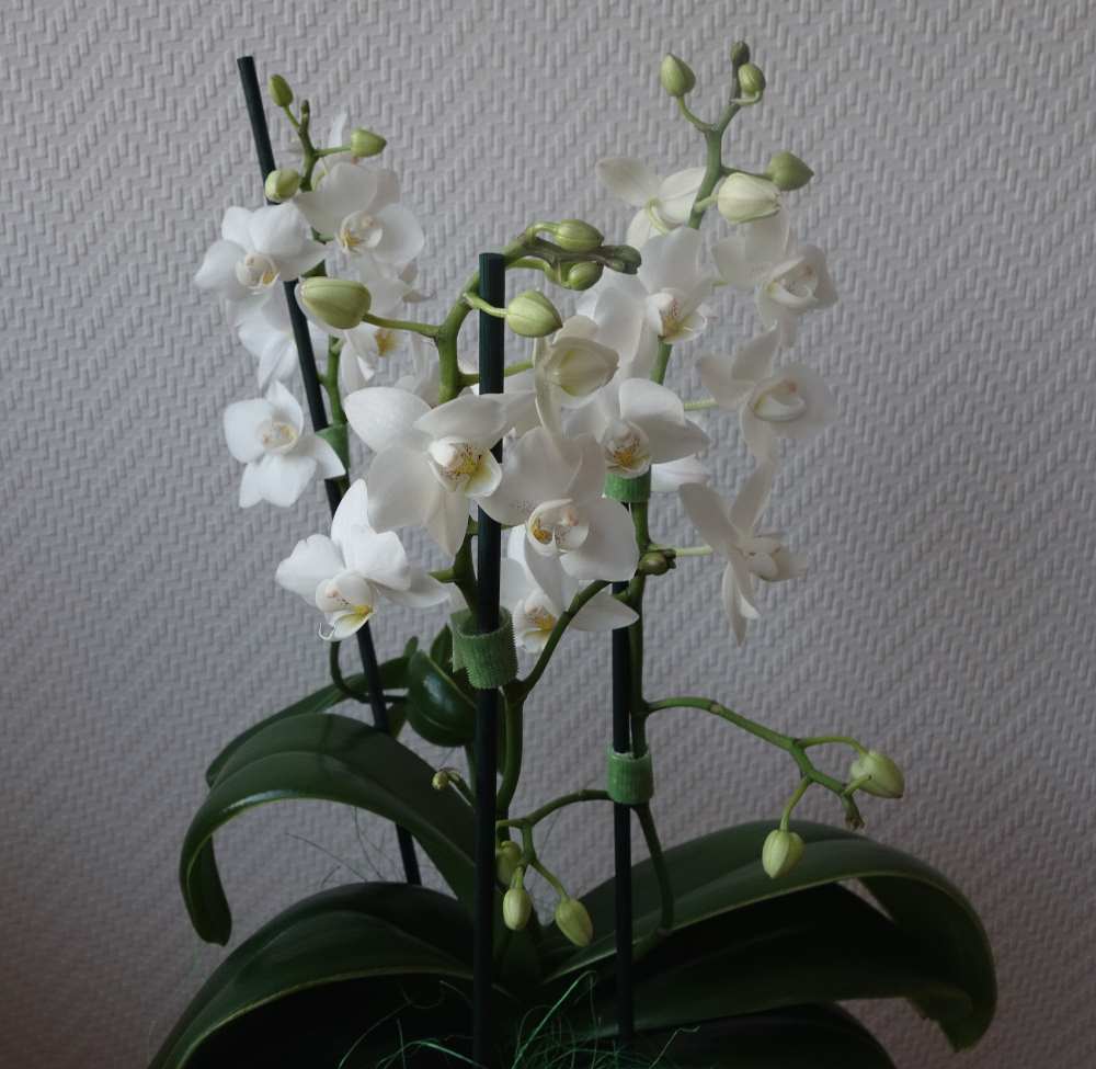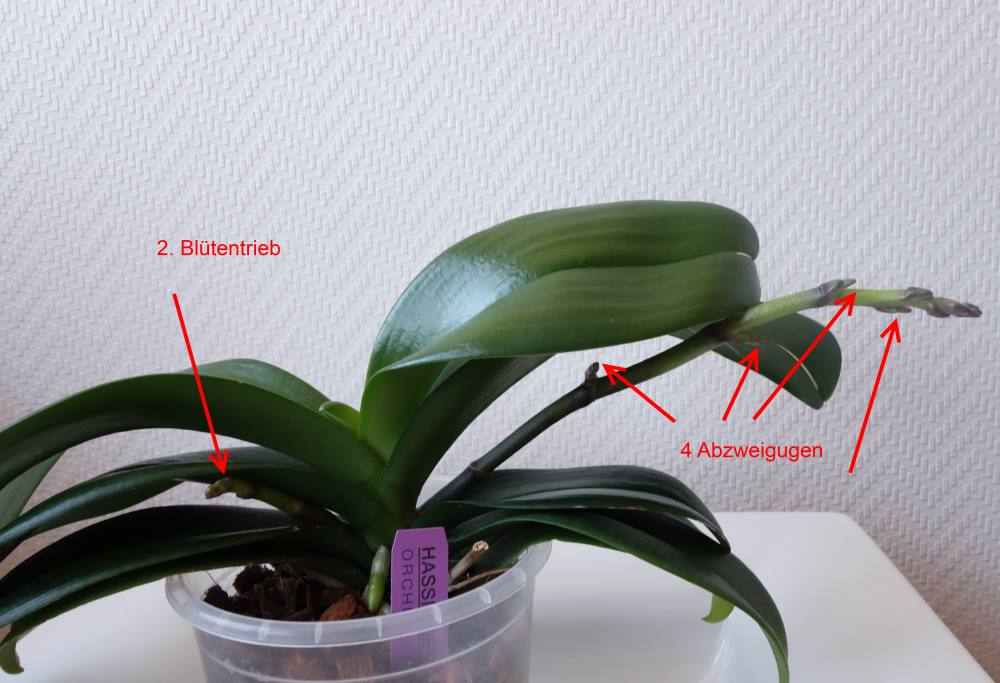 Gartenplaner,vielen Dank für Deine Hinweise! Dein Vorgehen ist auf jeden Fall die bessere Methode, um schön gerade Blütenstiele zu erhalten.Ich möchte aber durch den waagerechten Wuchs zum Licht die Apikaldominanz brechen lassen, sodass die Pflanze dann Verzweigungen und somit hoffentlich mehr Blüten bekommt.Ich besitze noch eine weitere Phalaenopsis, die ich ebenfalls als Geschenk erhalten habe. Diese Pflanze zeigt jetzt zwei Blütentriebe. Bei dem etwas älteren Trieb kann man schon vier Verzweigungen erkennen. Erst, wenn die Blütenstängel fast ausgewachsen sind, werde ich sie wieder vorsichtig aufbinden. Viele GrüßeElke