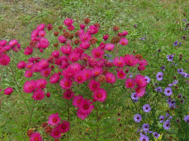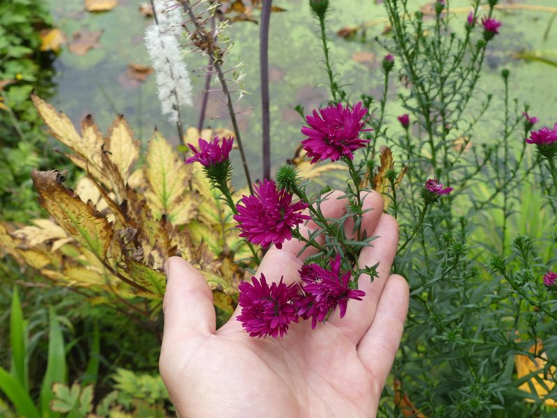 Die Glattblatt-Astern sind hier ziemlich trockenheitsverträglich. Umso besser, je länger sie eingewachsen sind. Wir haben sogar Typen, die fast ohne jede zusätzliche Bewässerung auskommen und dabei immer gut aussehen. Eine dieser Pflanzen ist großköpfig und blüht prächtig hell blau, treibt aber auch wüst Ausläufer. Die muss ich irgendwann mal vom Straßenrand oder einem Zaun geholt haben. Ich wollte sie für unseren damaligen dürren Sandfleck haben und da, wo ich sie gesehen hatte, stand sie auch so brennend heiß. - Mehltau ist für mich eine hinnehmbare Erscheinung, wenn er nicht schon weit vor der Blüte einsetzt und die Blüte darin verkümmert. Er kommt immer mal vor, ohne dass er die Astern-Szenerie dominiert.