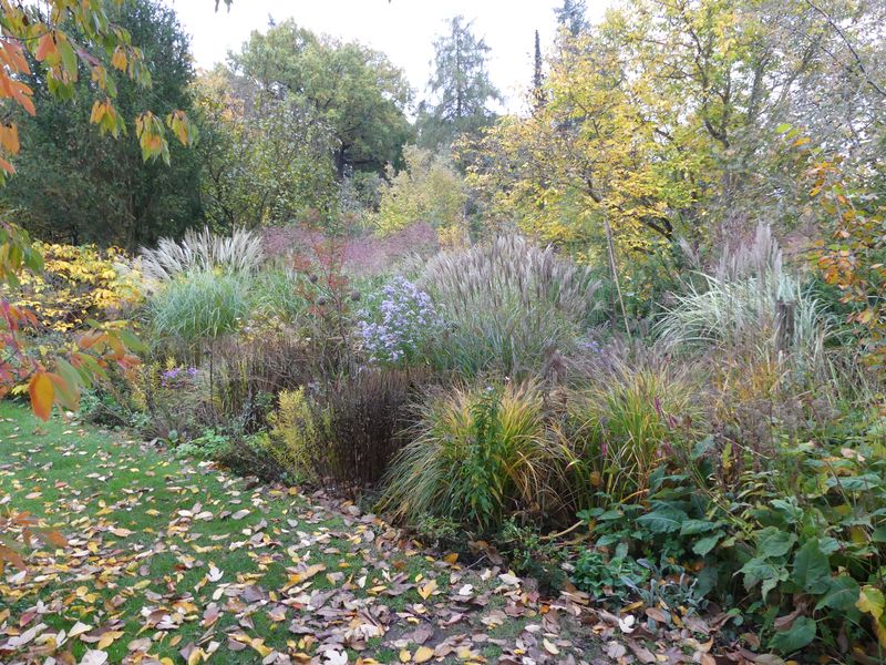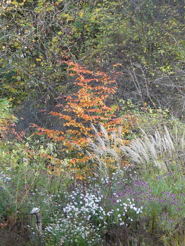 Und heute. Es fällt auf, dass die Präsenz von Aster 'Treffpunkt' fehlt, die angesichts der diesjährigen Trockenheit deutlich an Höhe und Üppigkeit eingebüßt haben. Aster 'Rosa Raureif' blüht noch gar nicht. Dennoch das Foto, weil Sorbus 'Autumn Spire' kurz vor dem Laubfall steht. Immerhin hat Aster 'James Richie' sehr schön zugelegt.