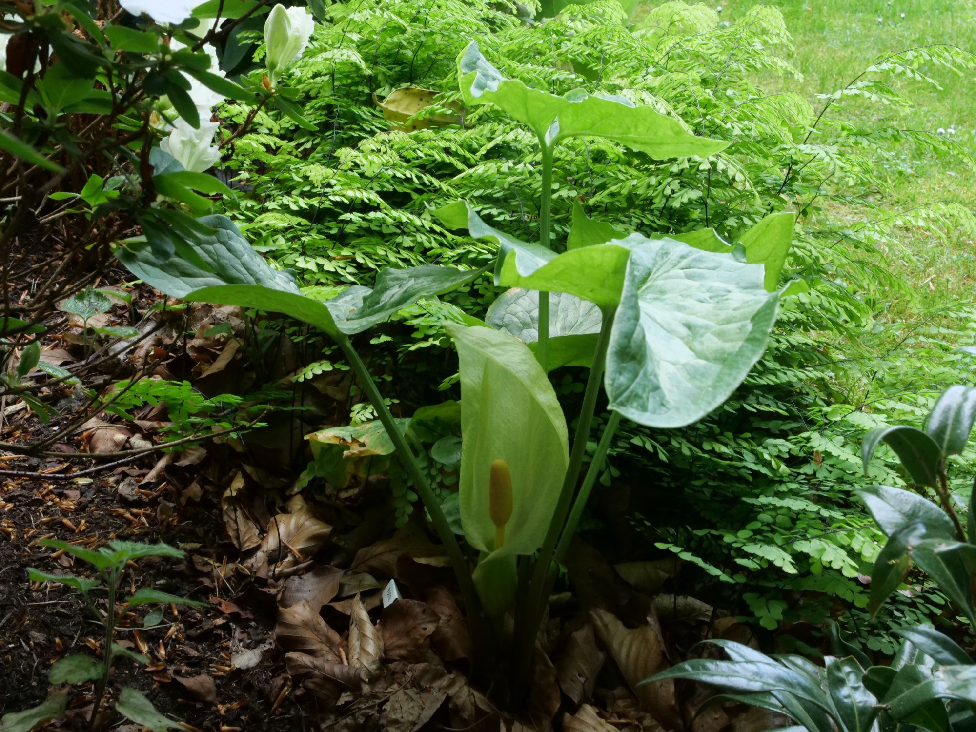 Arum italicum 'Chamaeleon' blüht. Die Spatha öffnet sich natürlich Richtung Gebüsch und ist kaum zu fotografieren. Bitte deshalb die mäßige Bildqualität zu entschuldigen.
