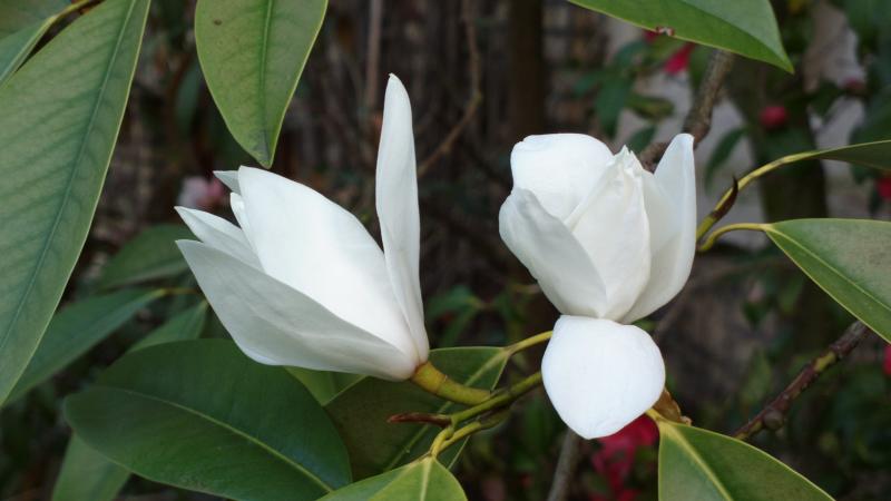 Magnolia laevifolia überlebt seit Jahren hier draußen,geschützt an einer Mauer gepflanzt und ihr dünner Stamm wächst zwischen einer Camellia rosaeflora.