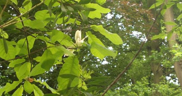 Magnolia fraseri var.pyramidata hatte ich in den Neunziger Jahren von Woodlanders.Ist ca.4m hoch und blüht seit Jahren.Die meisten Blüten sind leider weit oben.Hier eine aufgehende Blüte.
