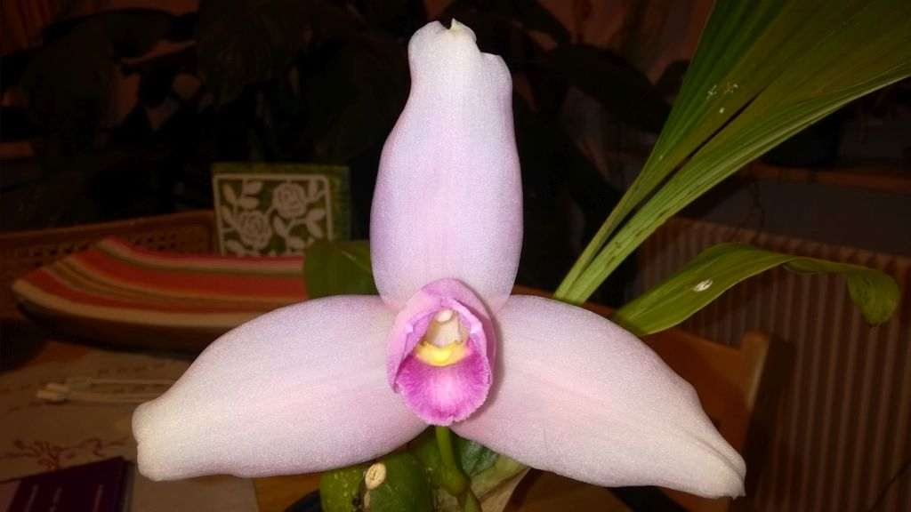 Hier blüht gerade eine junge Lycaste skinneri zum ersten Mal. Ich bin ganz begeistert von der schönen Blüte, und davon dass sie im warmen Zimmer zu halten ist!