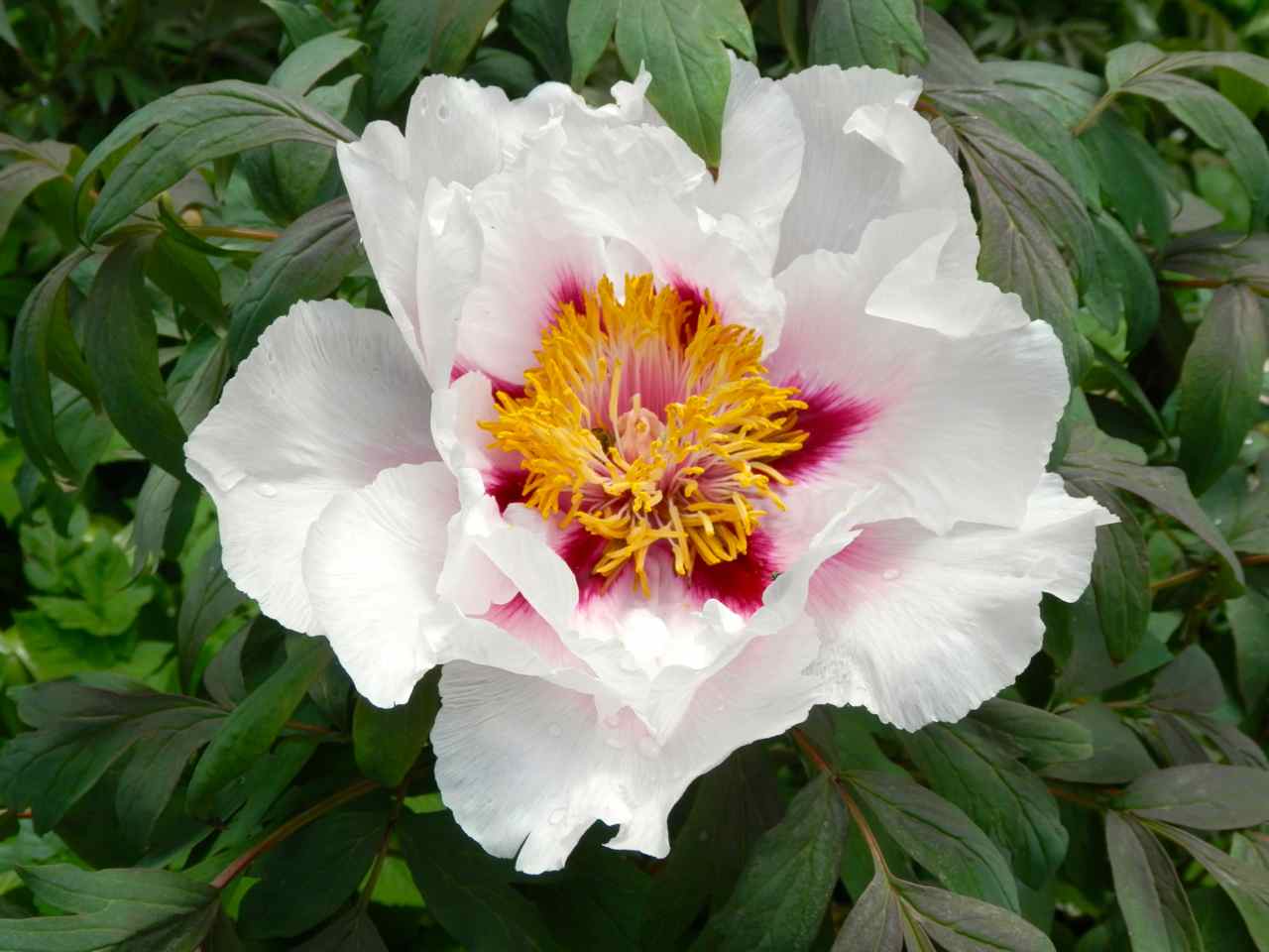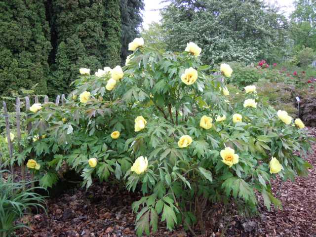 Beste Gelbe für mich eindeutig "Canary", eine Züchtung von Pfingstrosenlegende Prof. Saunders, 1940.Ungewöhnlich aufrechtwachsend (an die 2 m), Blüten aufrecht, Wuchs fast wie eine Rockii