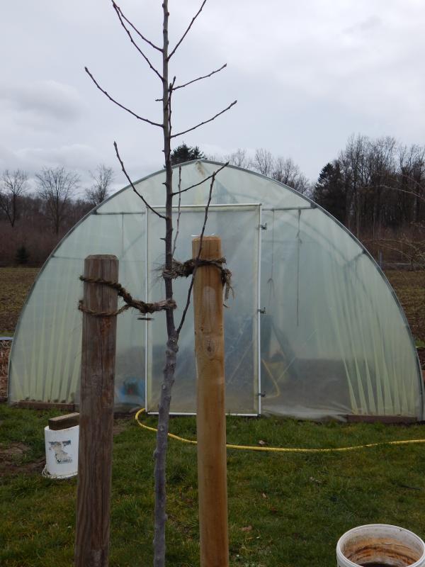 Mit dem vorhandenen Material könnte man in der Krone, so bei 1,8 - 2 m Höhe eine Kopulation auf ein passendes Ästchen machen. Einen Stab um den Ast gerade zu stellen und Bruch durch sich daraufsetzende Vögel zu verhindern. Auf einer Leiter stehend oder vorsichtig die Baumspitze herunter biegend, ist schon nicht ganz so einfach.