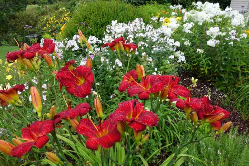 Scabiosa,so rund um unser Haus habe ich schon gemischte Beete, die eine Menge Pflanzen vertragen. Da machen sich große Taglilienhorste sehr gut. Für einige habe ich einen Kreis mit einem Durchmesser von einem Meter eingeplant. Die hohe Taglilie 'Schloss Bellevue' füllt diese Fläche mit ihrem Laub inzwischen gut aus.Wenn ich das Foto betrachte, fällt mir auf, dass ich dringend die Eibenkugeln schneiden muss, damit wieder etwas mehr Ruhe ins Beet kommt. Die Phloxe sind so ausbreitungsfreudig, dass sie durch die Beete schleichen und so das Gewusel verstärken. Auch da muss ich unbedingt etwas machen, weil sie in die anderen Stauden hineinwachsen. Viele GrüßeElke
