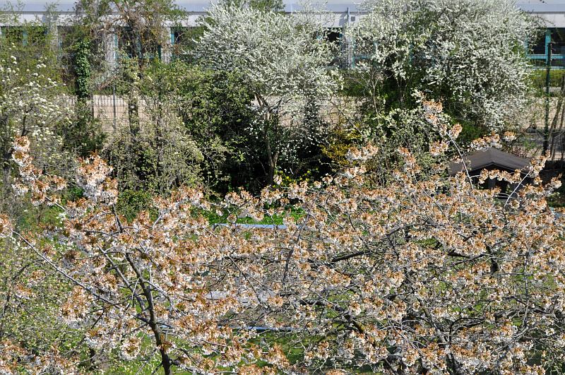 Die Temperaturen steigen und alles, was grünen und blühen kann, wird vertrauensseliger. Frühlingsblick aus dem Küchenfenster auf den Vorgarten in Wohnzimmergröße.