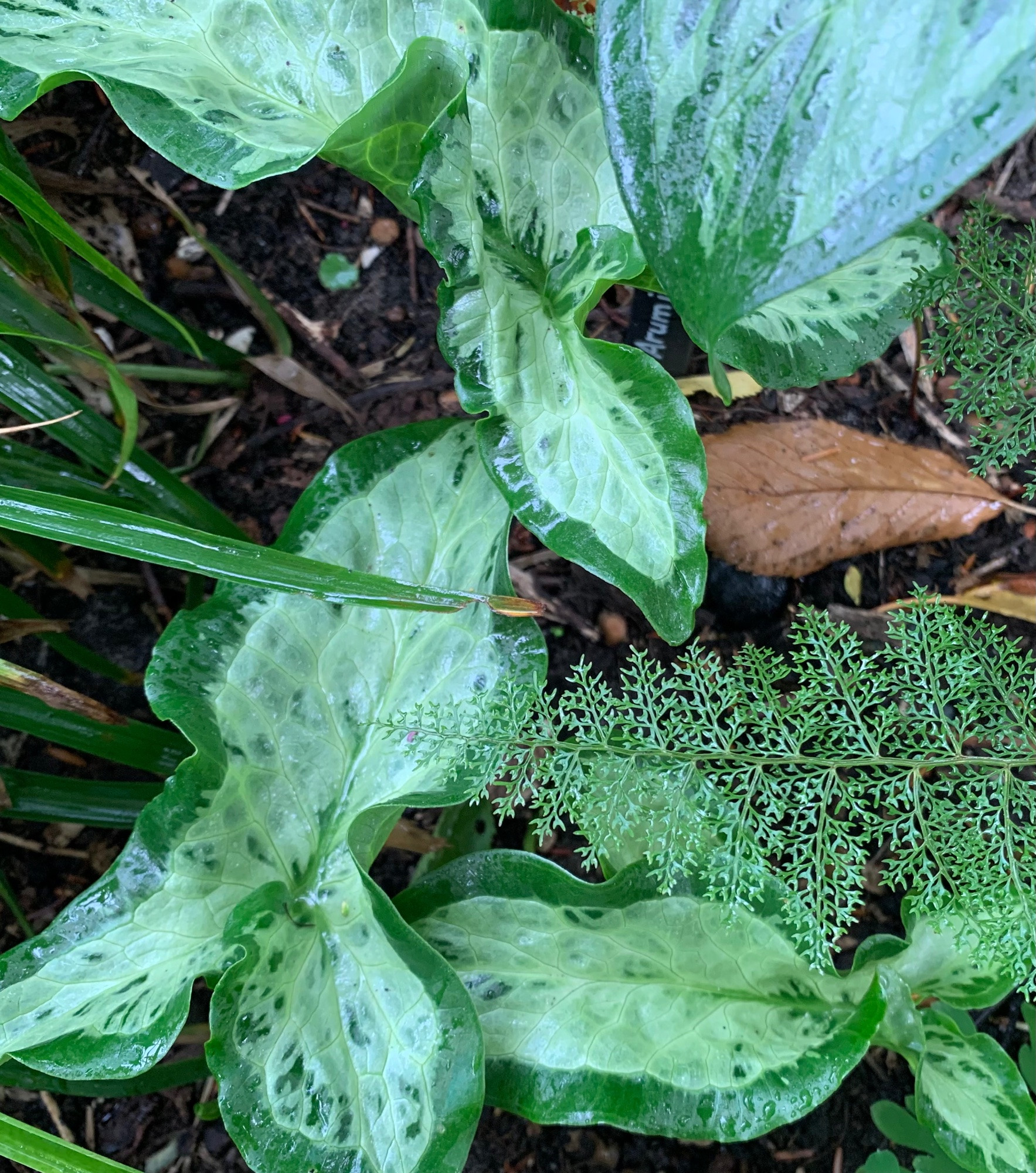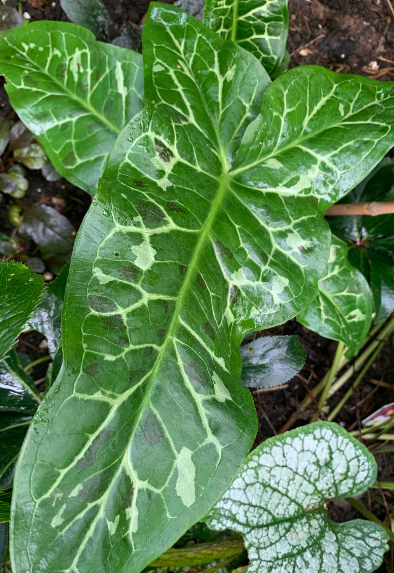 Besonders gefallen mir Arum italicum, weil die Blätter schon im Herbst erscheinen. Es gibt eine reichliche Auswahl mit Musterung, mit und ohne schwarze Punkte und auch ganz grüne. Sie benötigen den entsprechenden Hofstaat, um König über den Winter zu sein.