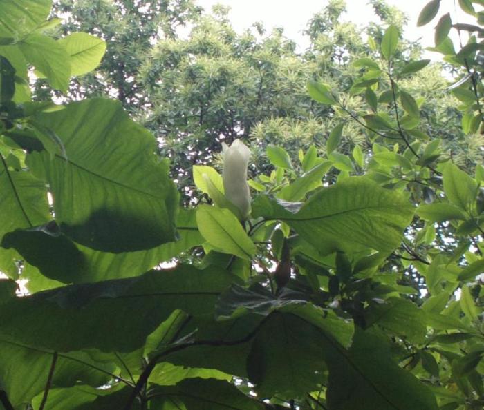 Magnolia macrophylla beginnt zu blühen. Hat dieses Jahr zahlreiche Blüten.Ca.5m hoch.