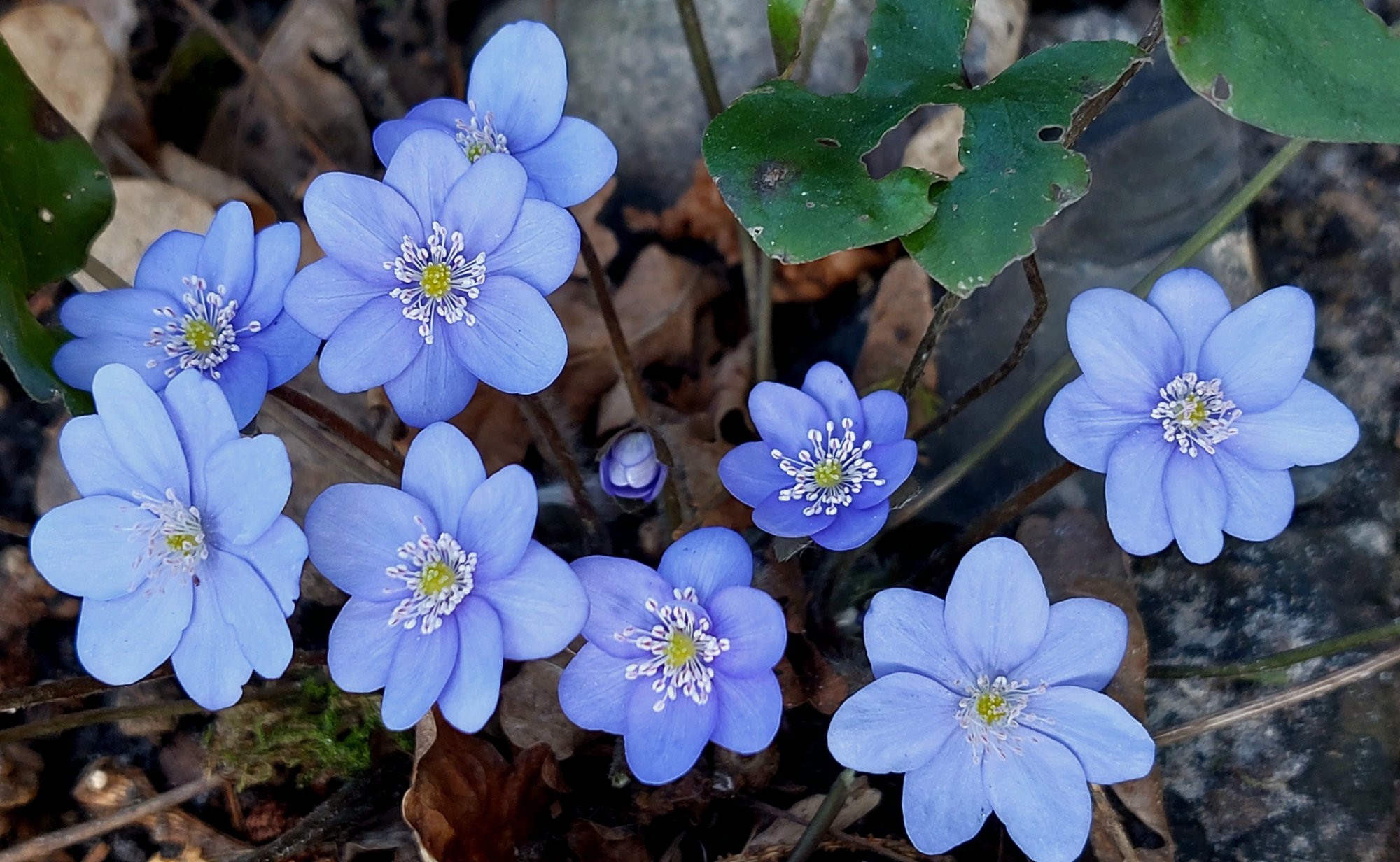 Es werden wahrscheinlich blaue wie die Mutterpflanze sein, die anderen stehen relativ weit weg. Und offenbar sind es sogar mehrere Generationen, zwei oder drei zeigen schon die typischen, flauschig behaarten dreiteiligen Blätter, andere herzförmige runde Blätter (wenn das auch Leberblümchen sind, aber ich nehme es doch mal an?).