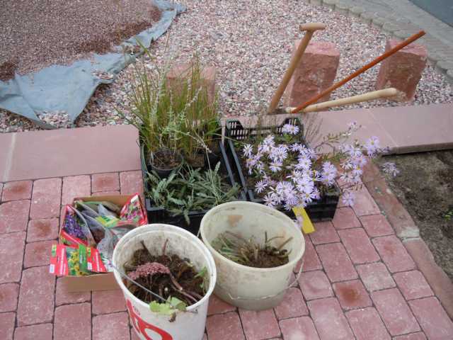 Das waren die Pflanzen. Diese "musste" ich besorgen, in völliger Aufopferung für das Gemeinwohl und völlig uneigennützig ;DPflanzenliste:1 Perovskia "Blue Spire"7 Calamagrostis x acutiflora "Karl Foerster"10 Aster pyrenaeus "Lutetia"6 Calamintha "Triumphator" (= Calamintha nepeta ssp. nepeta hort.)4 Salvia "Viola Klose"5 Sedum "Matrona"6 Achillea clyp. "Moonshine"Blumenzwiebeln:60 Crocus tommasinianus "Ruby Giant"40 Crocus sieberi "Firefly"60 Tulipa praestans "Fusilier"10 Narcissus cyclamineus "February Gold"60 Allium sphaerocephalon5 Nectaroscordum siculum bzw. Allium siculumKosten-Soll Pflanzen: 200 EuroKosten-Ist: ca. 140 EuroDer Baum geht extra.