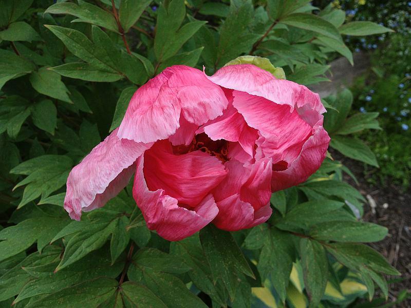 Ich hab ja nicht so viel Strauchpfingstrosen und auch erst relativ kurz.Aber ein paar Blüten gab es doch.Hier eine namenlose vom örtlichen Gärtner. Vorletztes Jahr blühend aber mit Mehltau (oder sonst einem Pilz) gesetzt hat sie letztes Jahr geschwächelt, aber dieses Jahr kam von unten ein kräftiger Trieb mit Blüte: