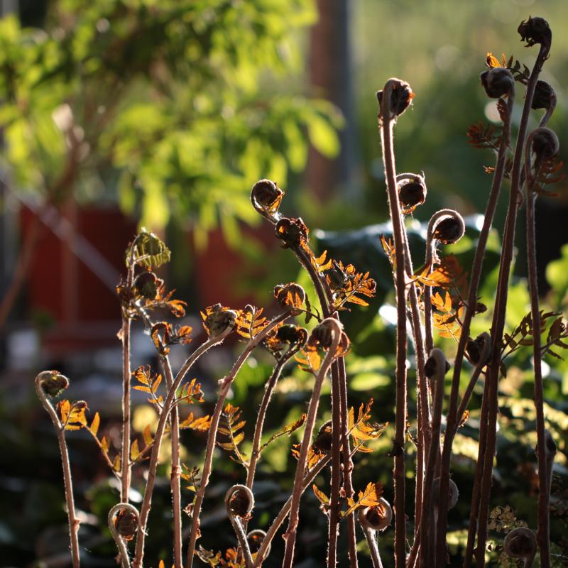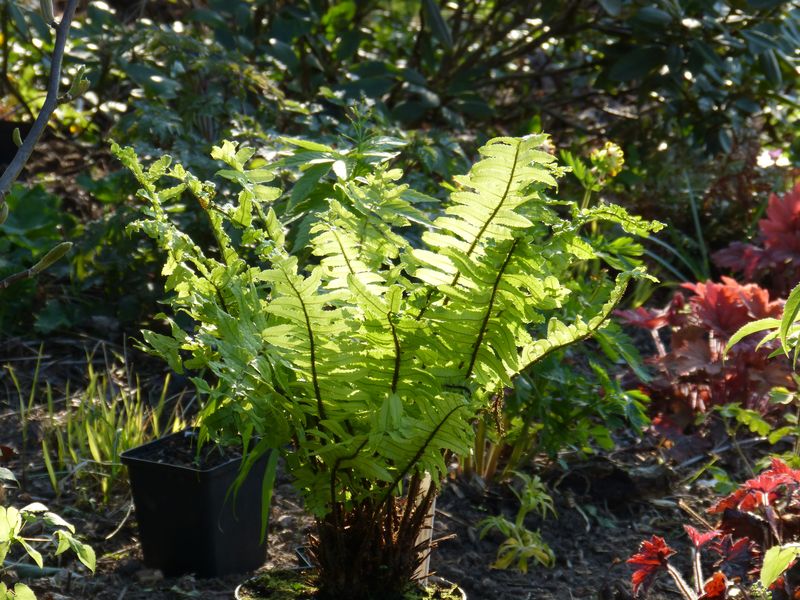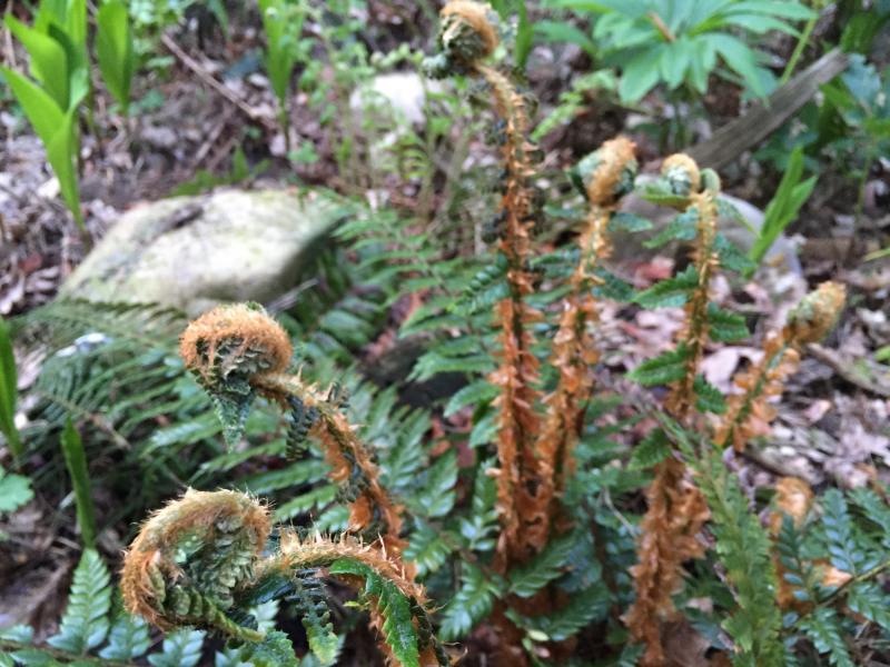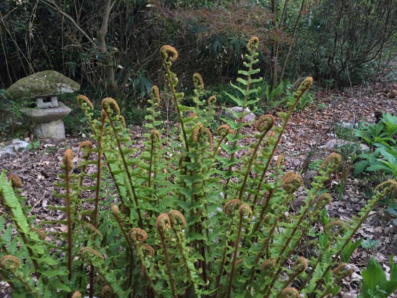 Das Teilstück des Polystichum rigens, letzten Herbst geteilt und gepflanzt, fängt an, einen Wedel zu entrollen, Pellea rotundifolia überlegt sich noch, ob sie den Winter überlebt haben will oder nicht