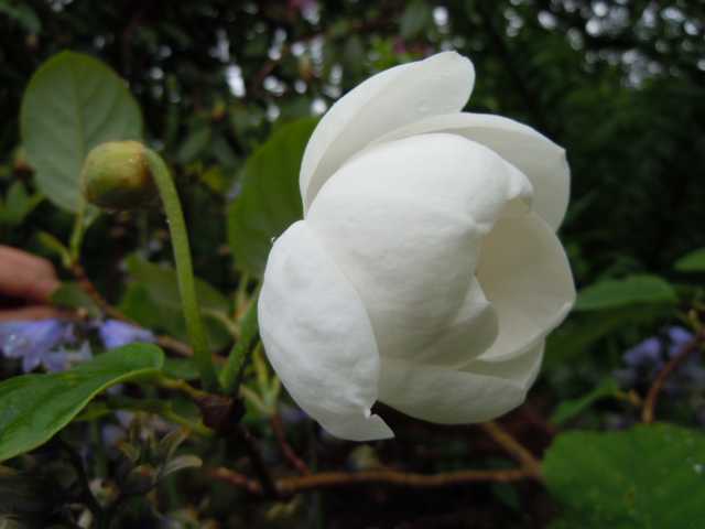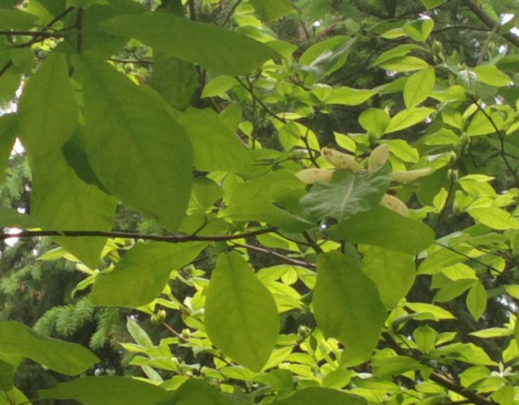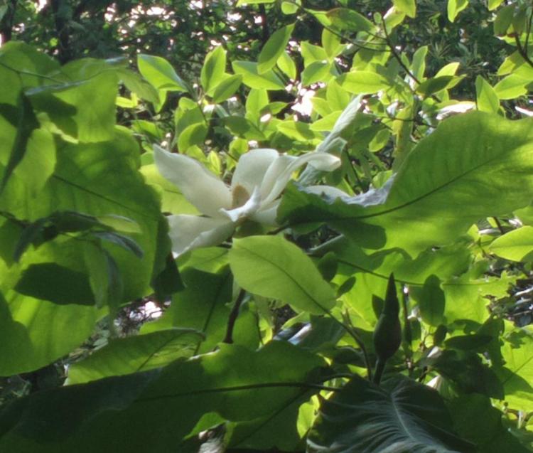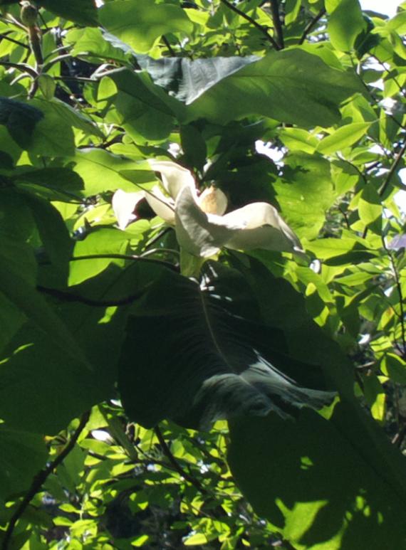 Magnolia macrophylla ist inzwischen aufgeblüht.Das Photo ist nicht ganz scharf,da stark gezoomt und vergrößert.Die Blüte ist in 4 m Höhe und ich stehe natürlich auch noch schräg entfernt. Im Vordergrund eine Blütenknospe. Die Blüten öffnen sich eine nach der anderen. Das feuchte Wetter ist für diese Magnolienart ideal,die bei trockenen Sommern nicht gut wächst,zumal der Baum am Steilhang steht,wo das Wasser sofort abfließt.Wenn das feuchte Wetter anhält wird er diesen Sommer einen schönen Wachstumsschub machen.Die kleinen Blätter im Hintergrund gehören zu Magnolia virgiana ,die später blüht.