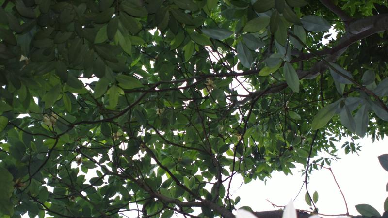 Magnolia virginiana ist auch ein Fall für's Fernglas. 1990 von Horstmann. Von unten photographiert.Wer genau hinschaut findet die Blüten.