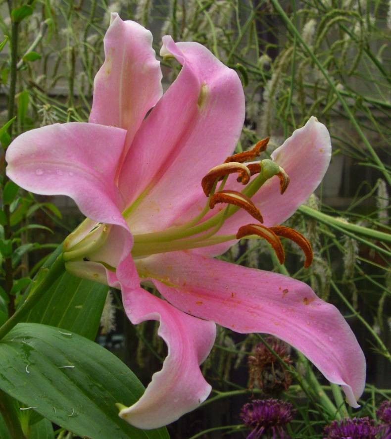 ... Lilium Antonia. Letzterer hat der gestrige Hagel die Spitze eines Blütenblatts "weggeschossen", aber sonst ist die Blüte noch in Ordnung.