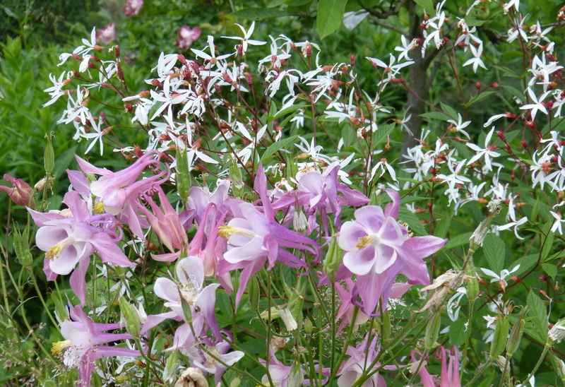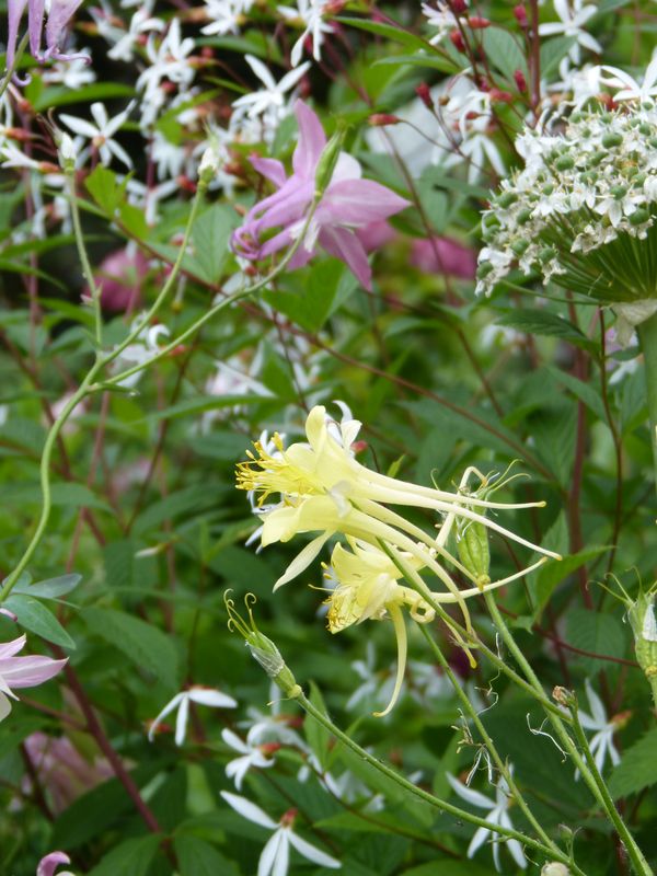 Bisher haben sämtliche Schädlinge die Akeleien hier verschont, ich hoffe das bleibt auch so. Heuer habe ich viele ähnlich ausgefärbte Pflanzen und die mit den verwaschenen Farben eliminiert. Sie sind jetzt so gut wie durch mit der Blüte hier. Wenn es mal wieder aufhört mit dem Regen schneide ich sie bodeneben samt Blätter ab. Sie treiben neue schöne Blätter nach, bekommen keinen Mehltau und die umstehenden Stauden haben mehr Luft und Platz zur Verfügung.