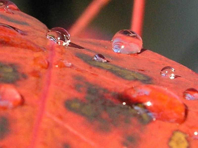 noch mehr Tropfen, hier auf prächtig rotem Perückenstrauchblatt