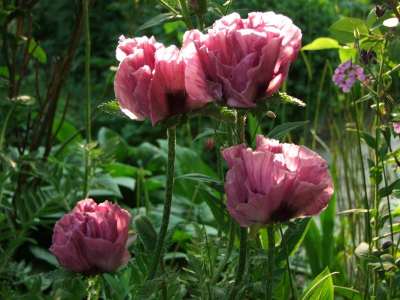 Hier haben die Mohne damit zu kämpfen, daß rundherum gedüngt wird. Sie stehen in den Staudenbeeten - auch im lichten Streuschatten (aber erst ab Mai, weil die Albizie spät austreibt). Sie haben aber drunter den schottrigen Mutterboden, bekommen keinen Dünger und auch keinen Bewässerungstropfer. Seit Jahren halten sich hier Royal Wedding, Patty's Plum und eine dunkelrote eher niedrige mit Riesenblüten (schwarze große Augenflecken). Eine pfirsichfarbene hat sich verabschiedet.