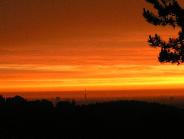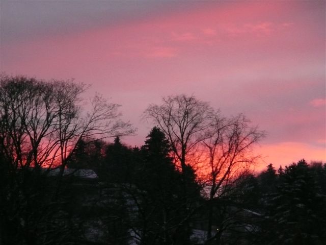 Dieses Foto habe ich im Juni 2005 morgens um 5 kurz vor einem Gewitter aufgenommen, es war das dramatischste Morgenrot, das ich je gesehen habe. Der Himmel war überall knallrot, dies ist z.B. ein Blick nach Norden, während es heute Morgen begrenzter war.Mein Foto von heute Morgen ist übrigens auch vollkommen unbearbeitet, es kann aber trotzdem sein, dass es etwas unterbelichtet ist und das rot deshalb feuriger aussieht als es in Wirklichkeit war. Ich weiß es nicht mehr so genau, aber ein flaues rot hätte mich nicht vor dem Frühstück zur Kamera greifen lassen.