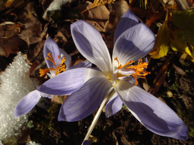 Morgens kalt bei -4 Grad, dann bei Sonnenschein immer wärmer, der Schnee taut langsam weg. Die Krokusse haben unterm Glassturz ausgeharrt und blühen nun unverdrossen weiter.