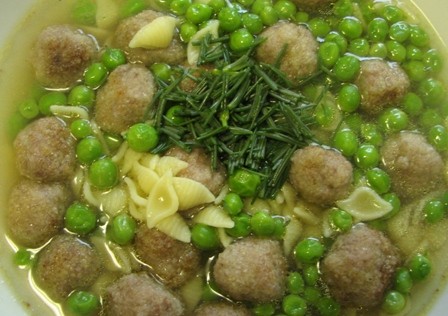 heute gab es erbsensuppe mit hack-griessbaellchen, gemuesefond von lacroix und nudeln.