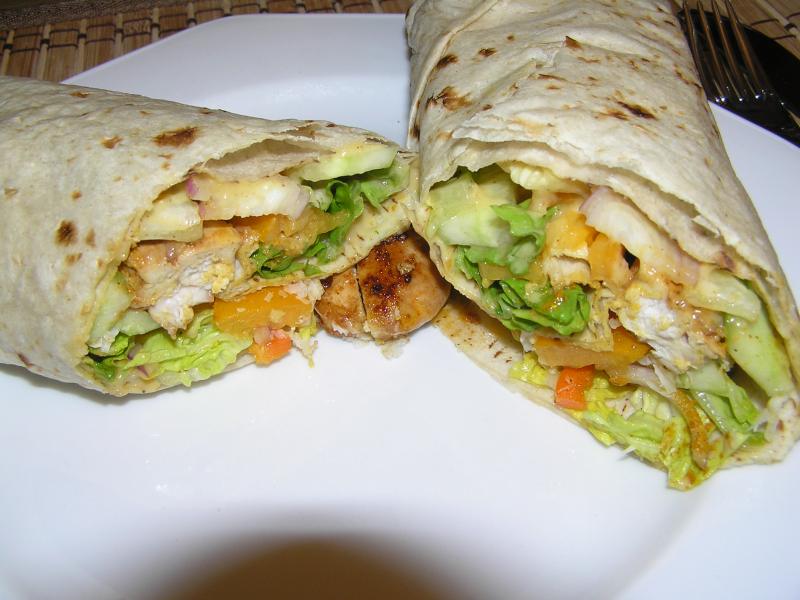 bei uns gabs heute "wraps".türkisches fladenbrot, belegt mit gebratenen hähnchenbruststücken, salat, gurken, tomaten, zwiebeln, paprika und lecker sößchen.so sah das ganze vorm zusammen rollen aus