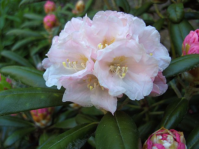 Er gilt als der perfekte Rhododendron schlechthin: Rhododendron yakushimanum und zwar die FCC-Form „Koichiro Wada“. Diese Art ist endemisch auf der kleinen südjapanischen Insel Yakushima und eine Ausleseform, die hinsichtlich Wuchs und Blattform, wie auch des geschlossenen Blütenstutzes keine Wünsche offen ließ, erhielt dieses hohe Auszeichnung und den Namen eines berühmten jap. Botanikers.Leider gibt es mehrere „Fälschungen“, die untr dem gleichen Namen vertrieben werden. Damit die schöne, geschlossene, halbkugelige Wuchsform möglichst lange erhalten bleibt, sollte der Standort sonnig sein.