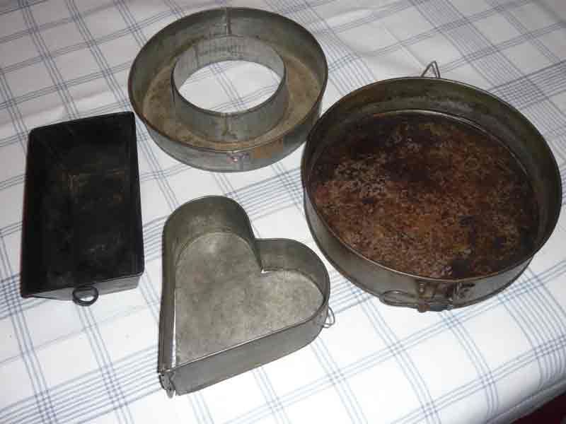 Also die gezeigten Backformen wurden ehemals aus verzinnten Stahlblech sogenanntes Weißblech gefertigt. Zinn ist lebensmittelunbedenklich und nicht zu verwechseln mit Blei. Aber selbst Stahlblech würde sicherlich nicht rosten da sich im laufe der Zeit aus Fett und Hitze eine Schicht aus Ölkohle bildet welche das Eisen schützt. Der gleiche Efekt tritt bei einer geschmiedeten eisernen Pfanne auf.Ebenso werden heute noch die kleinen Ausstechförmchen für Kekse aus Weißblech gefertigt. Diese Form stammt aus der Kaiserzeit und ist über 100 Jahre alt