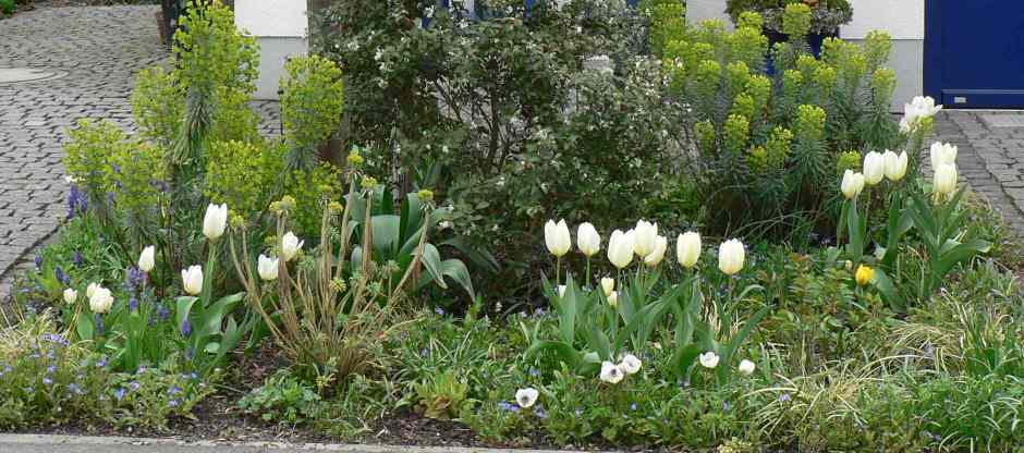 und 3. hab ich sie auch im Vorgarten. Hier lösen sie die Schneeglöckchen ab - und auch hier fehlt noch der Teppich. Kombiniert sind sie mit Mittelmeerwolfsmilch, Muscari, dem 2jährigen Vergißmeinnicht, frühen und späten weißen Tulpen und weißen Anemone coronaria