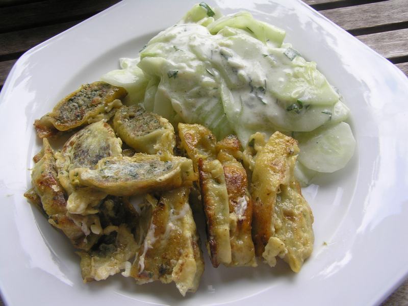 geröstete maultaschen (selbstgemachte aus dem tk), dazu gurkensalat aus eigenen balkongurken mit viel borretsch und dill