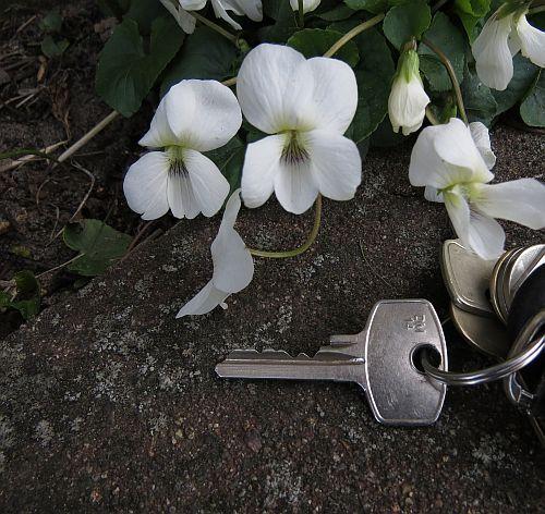 Bei unserer Nachbarin habe ich gestern ein weißblündes Viola sororia bestaunen dürfen, welches sich meiner Meinung nach durch besonders grosse Blüten auszeichnet. Zum Vergleich: der Bart vom Schlüssel auf dem Foto ist exakt 3,5 cm lang. In meiner Erinnerung sind die Blüten des weißblühenden Pfingstveilchens deutlich kleiner, oder täusche ich mich. Gibts vielleicht verschiedene Sorten/Klone?