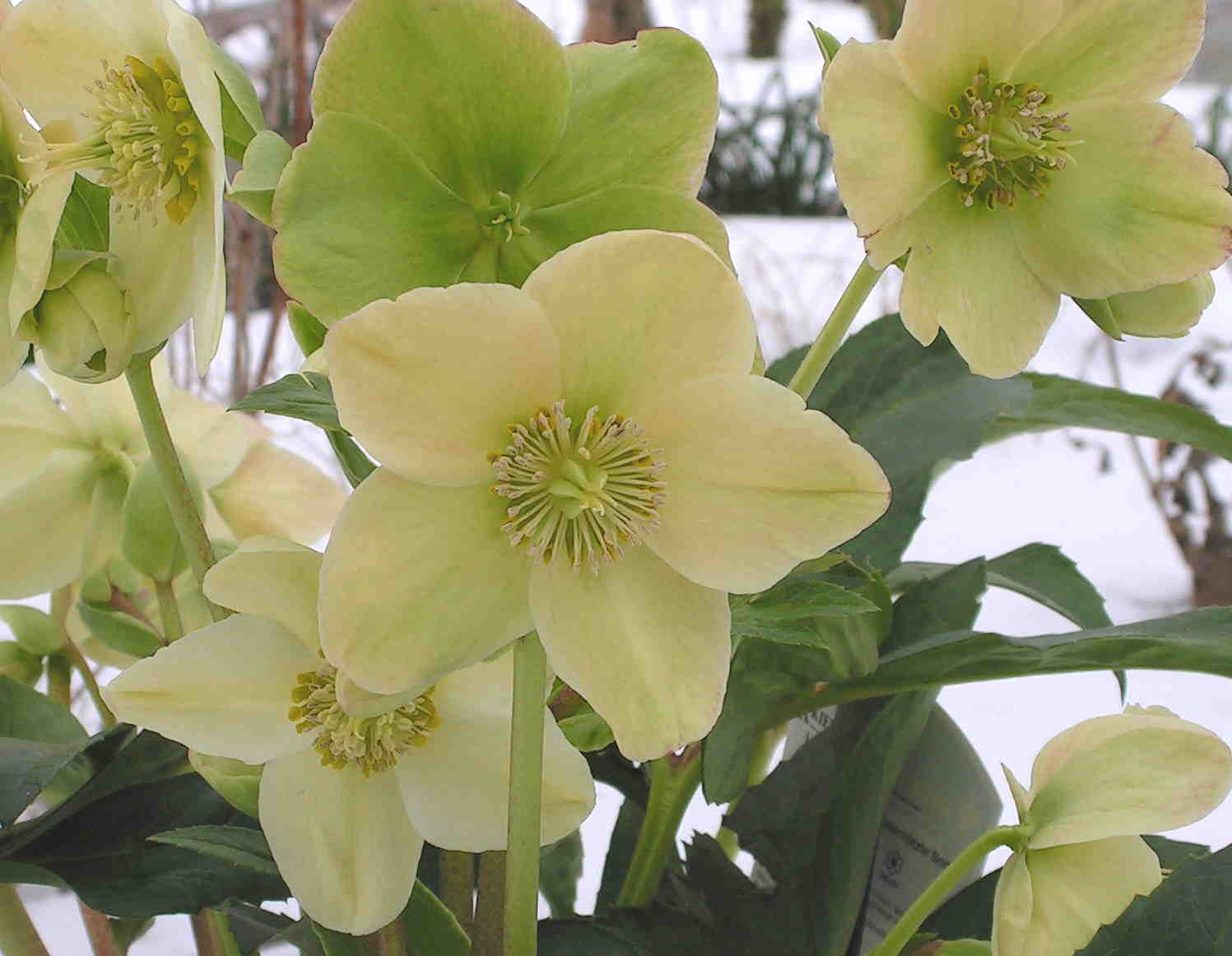 Hab mir vor drei Wochen aus dem Gartencenter eine Helleborushybride mit dem Namen 'Green Corsican' mitgebracht. Sieht sehr nach H. x nigricors (Hybr. aus niger mit argutifolius) aus, was es wahrscheinlich ist. Es sollen angeblich alles einheitliche Pflanzen sein, was nicht stimmt. Ein Großteil besitzt die angegebenen grünlichweißen bis grünen Blüten. Ich fischte aus den angebotenen Pflanzen eine mit cremeweißen Blütenknospen heraus. Sie besitzt auch die typischen Blätter von H. argutifolius, aber Blüten wie eine H. niger mit cremeweißen, bis blassgelbem Einschlag. Hier mal ein Foto: