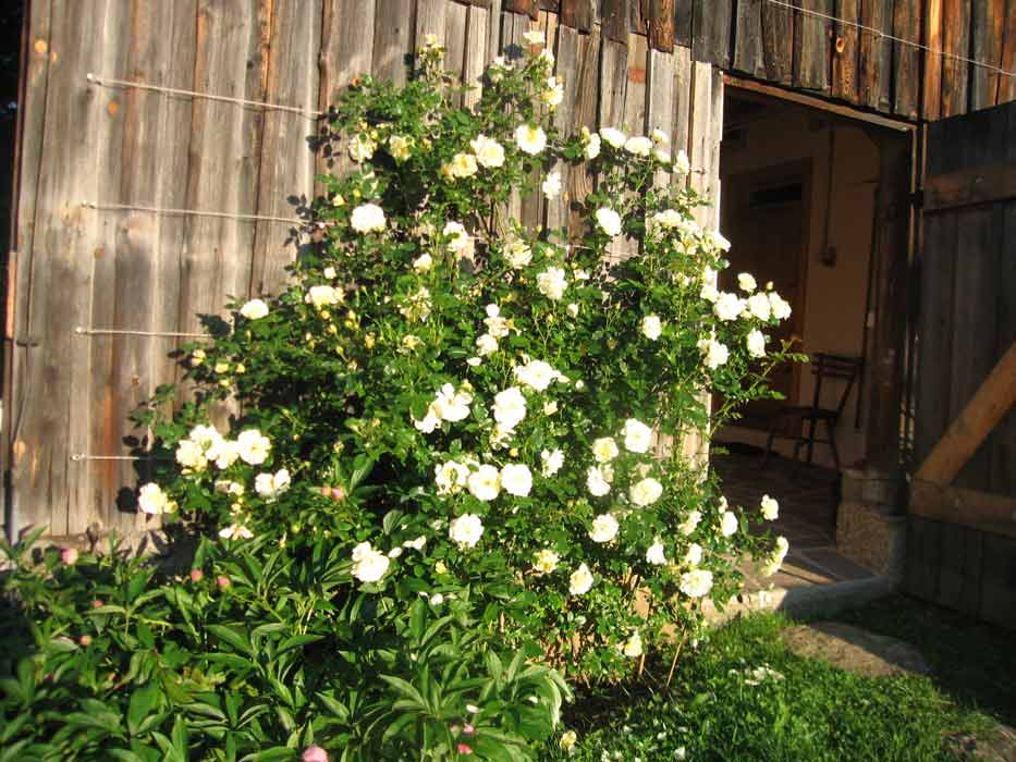 , sollte sie aber hier der Vollständigkeit halber nicht fehlen. Ich hatte sie geradezu bedenkenlos gesetzt, weil sie von Beales mit Zone 4 (!) beschrieben wird, und das bei einer gelben Kletterrose. Zwei mildere Winter hat sie, mit etwas Reisig geschützt, nahezu unbeschadet überstanden, nach dem dritten mußte ich sie bodeneben schneiden. Sie hätte wohl wieder ausgetrieben, aber meine schweren Herzens getroffene Entscheidung, sie wegzugeben, hat sich als richtig erwiesen, es wäre die folgenden Jahre wohl immer so gekommen. In einem etwas milderen Klima müßte diese dauerblühende, wüchsige, absolut gesunde und fein duftende Rose eigentlich die ideale sein, wenn man gelb mag.