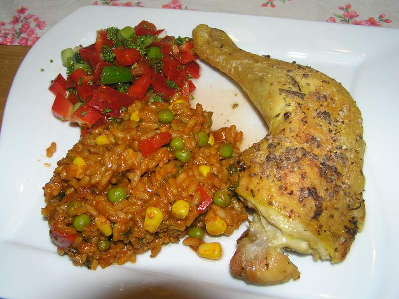 samstag hatten wir besuch. es gab kaffee und kuchen, abends gulaschsuppe mit baguette.sonntag waren wir zum geburtstagsbrunch eingeladen, abends hatte ich dann weder lust zum kochen noch großartig hunger.gestern hatten wir maishähnchenkeulen mit djuvecreis und restesalat aus paprika, frühlingszwiebel und petersilie