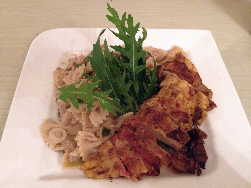 und abends gabs dann noch grillreste von einem bunten grillabend. vom nudelsalat mit thunfisch, kapern, olivenöl, zitronen und frühlingszwiebeln und der mit curry marinierten und bacon umwicklelten hähnchenbrust blieb einiges übrig. gut.