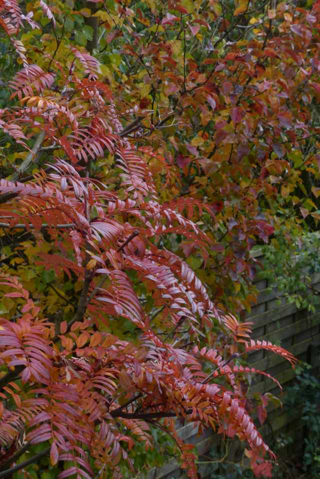 Wenn man auch Sträucher mit dazu nimmt, dann kommen auch Berberitzen in Frage. Da hab ich schon leuchtende Exemplare gesehen. Dann noch die roten Beeren...