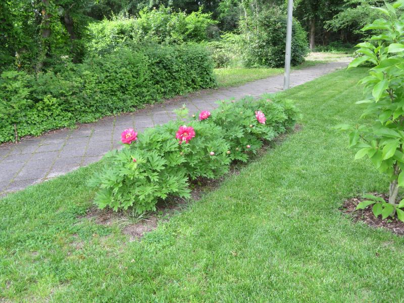 Letzten Herbst habe ich dann beherzt zum Spaten gegriffen, die Paeonien ausgegraben, in zwei bzw. drei Stücke geteilt und im Vorgarten versenkt. Jetzt erfreuen sich die Passanten am sonnenbrillenpflichtigen Pink ;D :D.