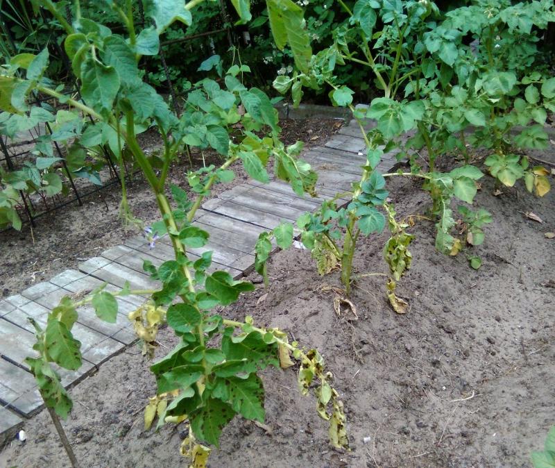 Meine Kartoffeln sehen dieses Jahr gar nicht gut aus. Der Mai war erst viel zu trocken, dann kamen diese zehn Tage subtropische Dauerfeuchte (wenig Niederschlag, aber fies feuchte Luft). Das Ergebnis sind ungewohnt kleine Pflanzen, von denen trotzdem die ersten umfallen und/oder schwarze Flecken auf den Blättern haben