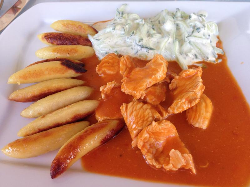 putenstreifen mit paprikasoße, schupfnudeln, gurkensalat