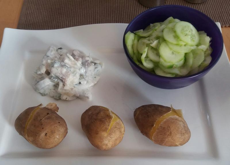 Matjes in Joghurt mit Pellkartoffeln und Gurkensalat.